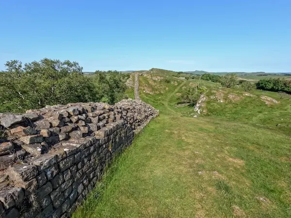 Vandra längs Världsarvet Hadrianus mur som går i ett grönt och stundtals pastoralskt landskap genom hedmark och skog.