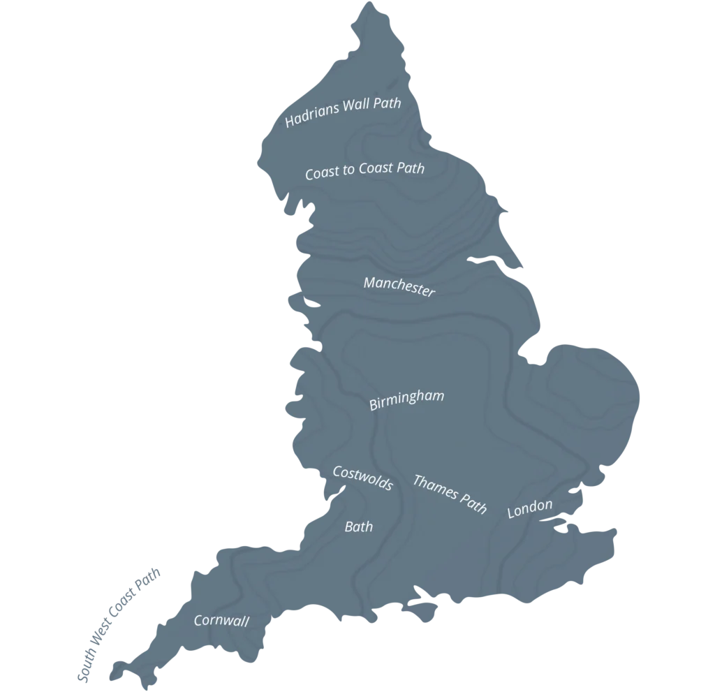 Utforska Englands natursköna vandringsleder och stigar, från de mjukt böljande kullarna och honungsfärgade husen i Cotswolds till det dramatiska landskapet med höga berg och djupa sjöar i Lake District . South West Coast Path är känt för sin spektakulära klippkust och sina vackra stränder medans Hadrians Wall Path i norra England följer den romerska muren med samma namn. Thames Path är i sin tur en rofylld, kulturell vandring som följer den ikoniska floden Themsen.