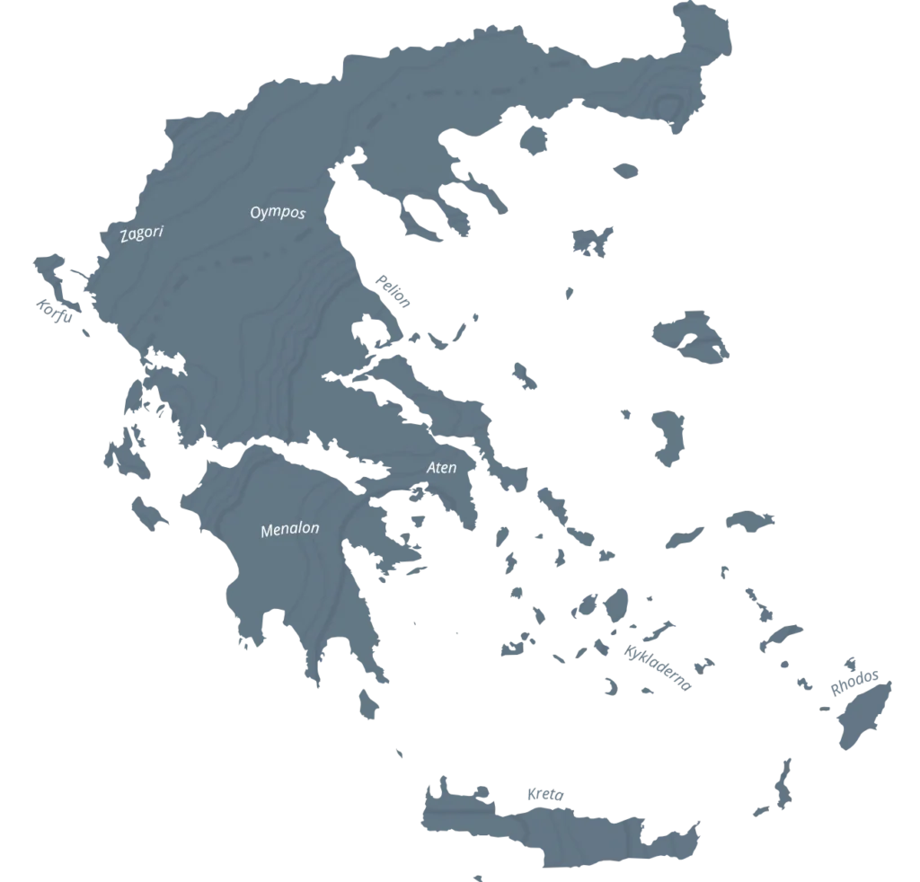 I Grekland känner du doften av oregano och timjan när du vandrar. Här kan du upptäcka fastlandets dramatiska natur med höga berg, djupa raviner, blommande ängar och kristallklara floder. I den mindre kända regionen Zagori utforskar du charmiga stenbyar som är sammanlänkade med kullerstensstigar och broar. En toppvandring till Olymposberget är en utmaning så god som någon och på Pelionhalvön hittar du ytterligare en region med pittoreska bergsbyar. Här vandrar du i ett rofyllt landskap med utsikt över det glittrande Egeiska havet.