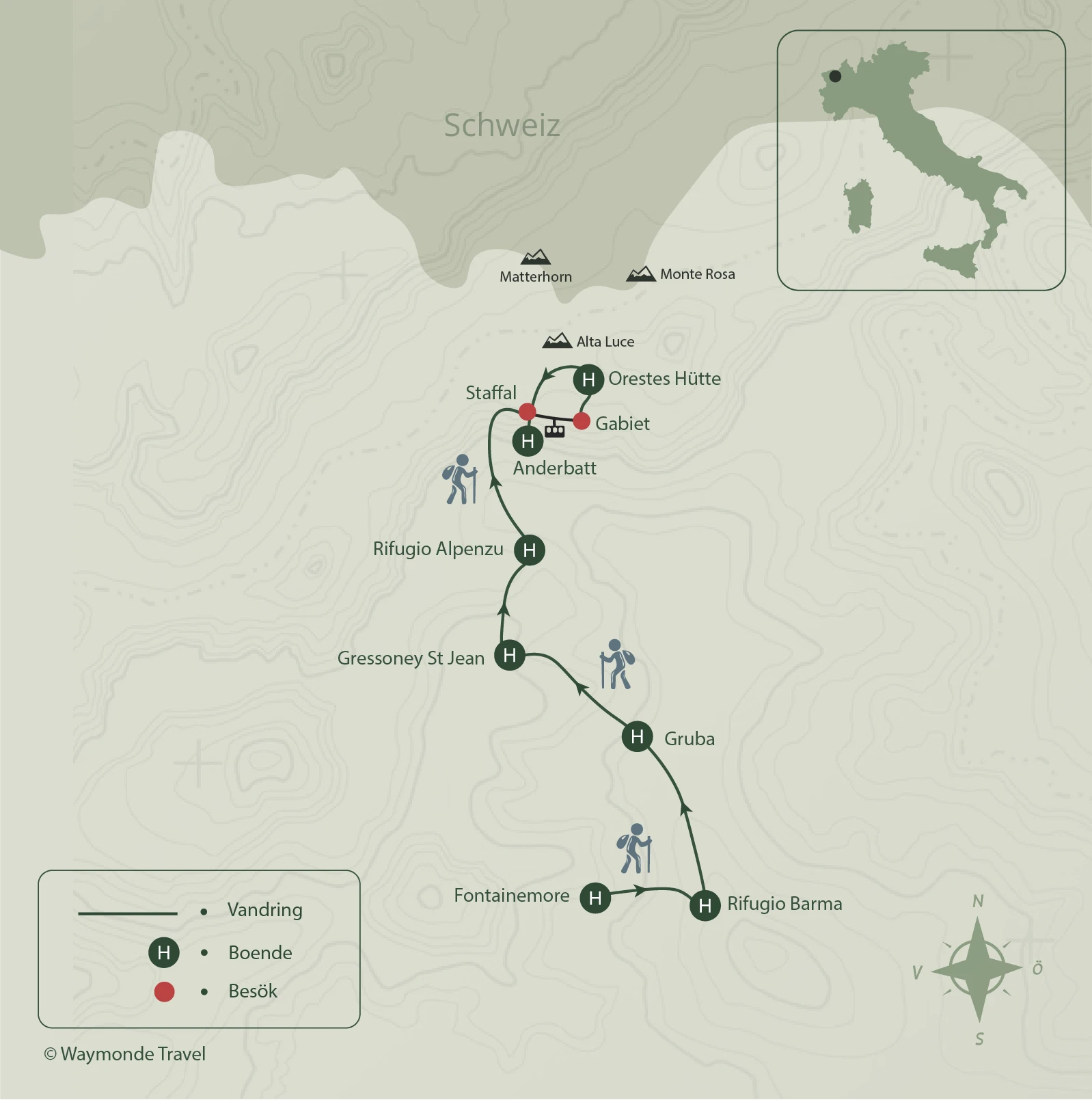 Dagens vandring kallas också för Monte Rosa-etappen eftersom Rosaberget är ständigt närvarande. Du passerar flera ”alpeggi” – områden där kor och får betar under sommarmånaderna. Walserkulturen är speciellt närvarande i detta område. Walser är en tysk nomadbefolkning som har levt i trakten sedan medeltiden tack vare deras förmåga att bruka jorden på hög höjd. Arkitekturen och dialekten är en spegelbild av deras kultur vilket Alpenzu Hut är ett bra exempel på.