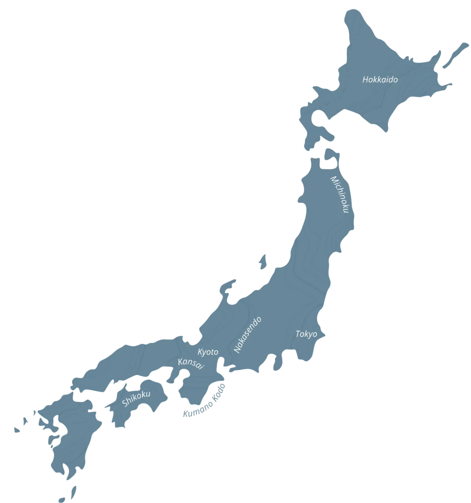 I regionen Kansai kan du utforska de historiska huvudstäderna Nara och Asuka som ligger på bekvämt avstånd från Kyoto. Vi kan även hjälpa till med vandringsresor i andra regioner såsom Shikoku, Michinoku och på ön Hokkaido uppe i norr.